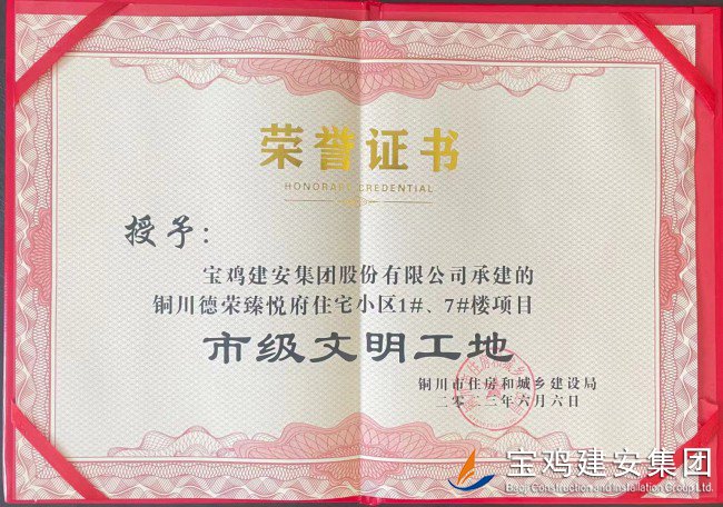 與此同時,由寶雞建安集團第四分公司承建的銅川新區(qū)德榮臻悅府小區(qū)項目(距雍照華府項目5公里),也在此次活動中,被授予“銅川市文明工地“榮譽稱號。