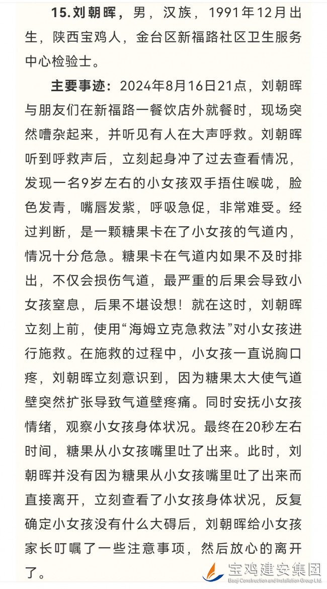 | 日前,寶雞市見(jiàn)義勇為基金會(huì)面向全社會(huì)對(duì)擬發(fā)布為“寶雞市見(jiàn)義勇為人物”人選進(jìn)行了公示,經(jīng)由公司工會(huì)推薦上報(bào)的新福路社區(qū)衛(wèi)生服務(wù)中心檢驗(yàn)士劉朝暉同志光榮入選,榜上有名。 此前,劉朝暉同志危急時(shí)刻搶救小孩的先進(jìn)事跡經(jīng)網(wǎng)絡(luò)轉(zhuǎn)發(fā)后,《寶雞日?qǐng)?bào)》等主流媒體亦對(duì)其進(jìn)行專(zhuān)訪并公開(kāi)報(bào)道宣傳,曾引發(fā)社會(huì)各界廣泛好評(píng)與高度贊譽(yù)。 |